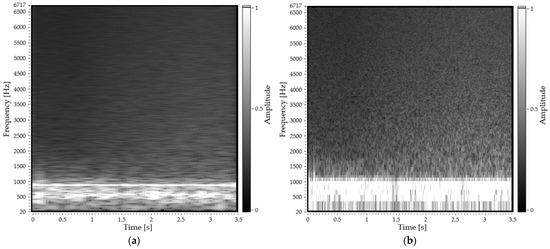 Sound recordings transformed to spectrograms 1, which have greater window length, tend to decrease the accuracy rate with noise increasing more or less linearly. On the contrary, a neural network trained on data transformed by spectrograms 2 could process slightly noisy records, but from +6 dB of nominal noise level, it could not learn any credible decision-making criterion, thus confirming the classical analytical method results. Simply put, the noise on this kind of spectrogram tends to overdraw the signal components’ expressions more aggressively. For a direct comparison of both spectrogram types, see Figure 12.