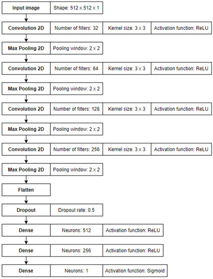 The last layer of the used CNN model contains a single neuron that relies on a Sigmoid activation function [62], thus neuron value varies from 0 to 1. The sample is classified as class according to (3).
