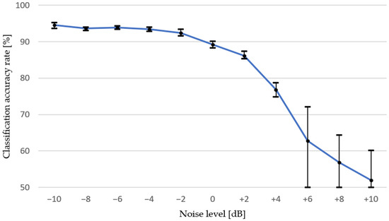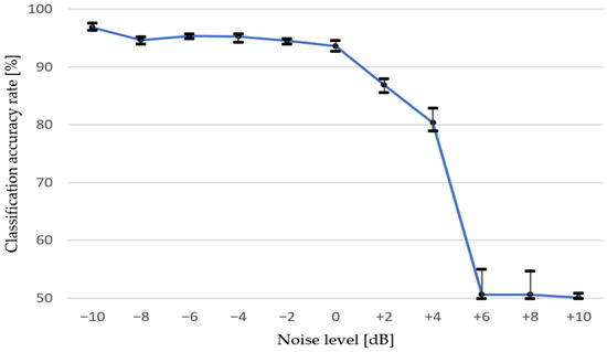The total number of generated datasets was 22 per spectrogram type, where the intensity of noise gradually grew from −10 dB to +10 dB with steps of 2 dB. To eliminate any statistical errors from the classification accuracy of a trained neural network, the training was performed multiple times for all datasets. The first experiments were done on datasets with images of spectrogram 1.