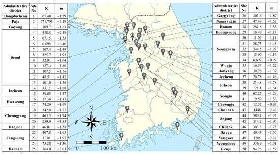 After both sides of Equation (9) are logged, it is equivalent to the same form as Equation (8), so MnLRA can be generated in the same way. Besides, since the empirical formula of Equation (6) is also in exponential form, MnLRA was chosen as the exponential form in this study. It is important to confirm that the model is statistically significant through F and p-values of the results of an analysis of variance (ANOVA) and p-value of a partial regression coefficient in the multivariate regression analysis.