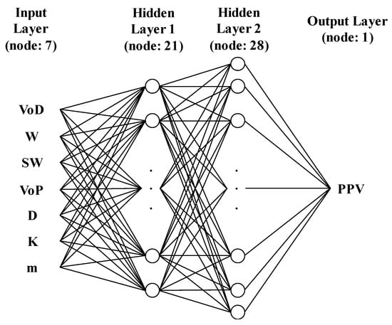 In the results of trial-and-error analysis, the average validation loss of 540 structures was 0.126 cm/s. Among the 540 ANN models, the structure composed of two hidden layers with 21 and 28 nodes, normalized by min-max scaling and combined with ReLU showed the lowest validation loss of 0.115 cm/s. Therefore, we selected the ANN model, which has the 7-21-28-1 structure depicted in Figure 4 as an optimal ANN model for a PPV prediction. The training of this model was stopped at 4208 epochs by early stopping. Table 5 summarizes the characteristics of the selected ANN model. This model is represented by Equations (10)–(12). PPV is calculated by Equation (10). Equations (11) and (12) represent hidden layers 1 and 2, respectively.