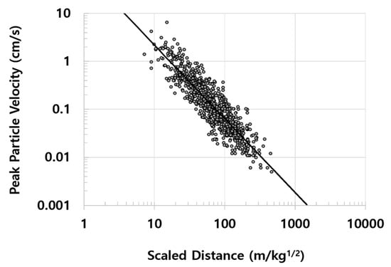 To derive one representative empirical formula for the 50 sites, we calculated K and m values of 74.9 and −1.535 using datasets of 50 open-pit blasting construction sites. Equation (15) expresses the representative empirical formula and it was defined as EF-3. Since this is a representative equation of 50 sites, it will show lower prediction accuracy than EF-1. However, it could be used at the preliminary design stage like EF-2. Figure 5 shows EF-3 (solid line) and the 893 datasets (circles) on a log-log plot where the vertical axis is PPV and the horizontal axis is SD. As mentioned in Section 2.2, EF-3 was obtained from the linear regression of the 893 blasting datasets.
