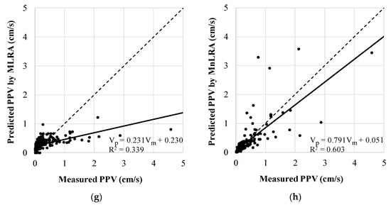 Each predicted PPV by the six prediction methods is plotted as a small circle in Figure 6a to 6h respectively according to prediction methods. The x and y axes represent the measured and predicted PPV, respectively, in cm/s. There are two lines in each figure. The dashed line is the Measured PPV = Predicted PPV (1:1) line and the solid line is the linear regression line. In the lower right corner of each figure, it shows the equation of the linear regression line and R2. The linear regression line resulting from the ANN shows the best result in terms of similarity to the 1:1 line as shown in Figure 6. The linear regression line resulting from the MLRA displays the greatest distance between the two lines.