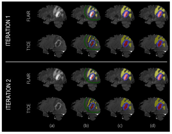 Example showcasing the result improving as a function of invested time. In the first iteration, the user quickly draws over the different areas. In the second iteration, the user places few additional labels to correct representative misclassified areas, which are then used to retrain the machine learning model. From left to right: (a) Anatomical image; (b) User annotations; (c) Result segmentation; (d) Ground truth segmentation.
