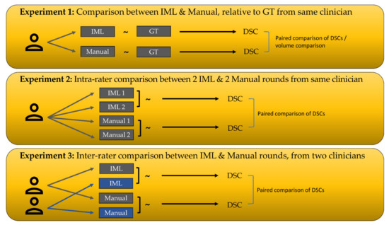 The DSCs between the two IML-assisted and the two manual segmentations of each rater were calculated (i.e., DSCIML1/IML2, and DSCManual1/Manual2) for each case. The DSCs were statistically compared. In addition, the existence of significant differences between the DSCs of the manual and IML-assisted segmentations relative to ground truth (i.e., DSCIML/GT, and DSCManual/GT) were also statistically compared for each rater separately, to see how many raters were consistent using our method and how many when doing manual segmentations.