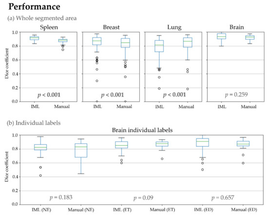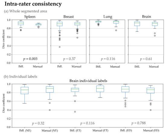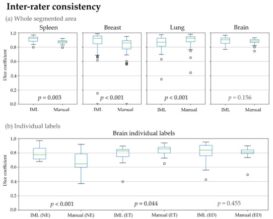 In the last experiment, inter-rater consistency of IML and manual segmentations was calculated and compared (Table 1, Figure 7). There was a significant difference for spleen, breast, lung, and the NE and ET glioblastoma sub-regions. From those, our method achieved a higher overlap for spleen, breast, and the NE glioblastoma sub-region. Conversely, manual segmentations had higher agreement for lung and the ET region.