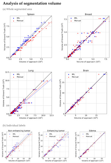 Scatterplots in which blue points are the pairs of volume of Interactive ML (IML) method and volume of ground truth and red are the pairs of manual segmentation volume and ground truth. The black line represents the ground truth’s volume. The plots belong to (a) Different cohorts where all individual labels, representing different areas of the structure, are counted as one; (b) The sub-regions of glioblastomas.