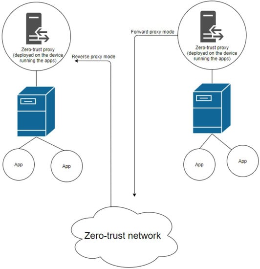 To circumvent the management issues created by adding more hardware into the network in order to enable legacy systems, Gilman and Barth [6] proposed that proxy servers could be deployed at the application level in order to bridge the gap between legacy systems and the rest of the zero-trust network. This solution, visualised in Figure 1, involves using a forward proxy to allow legacy systems to communicate with a zero-trust system and a reverse proxy to allow the zero-trust system to communicate back to the legacy system [6].