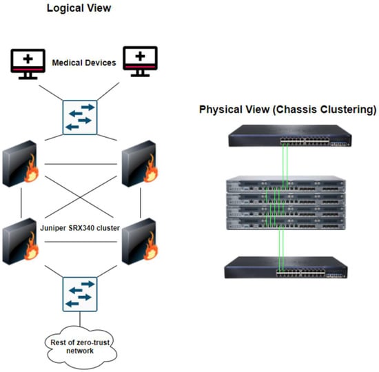 It is imperative that policy enforcement is applied correctly, as accidentally blocking communication from medical devices could result in the interruption of patient care [8]. As network administrators are unable to manage or control medical devices themselves, the only option is to apply policy enforcement on an external device, such as a firewall [9]. However, one firewall placed at the edge of a medical device creates a point of failure, which would have devastating consequences on patient care if the firewall were to fail. By placing a cluster of firewalls at the edge of the most important medical devices, network redundancy is ensured, and these devices are able to comply with the zero-trust model [10]. Figure 2 shows a visualisation of this proposed solution, which utilises multiple Juniper SRX340 firewalls to create a cluster of firewalls which logically act as one device.