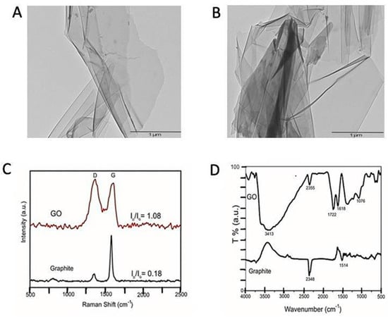 GO characterization: (A,B) TE_micrographs of GO; (C) Raman spectrum for both carbon-based materials; and (D) FTIR spectrum profile for GO and graphite samples, respectively.