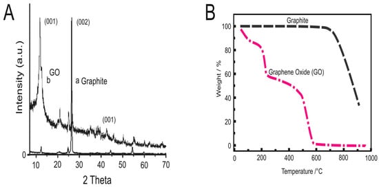 (A): XRD profiles of Graphite (a) and GO (b); (B): TGA curves for GO (pink curve line) and graphite (black curve line).