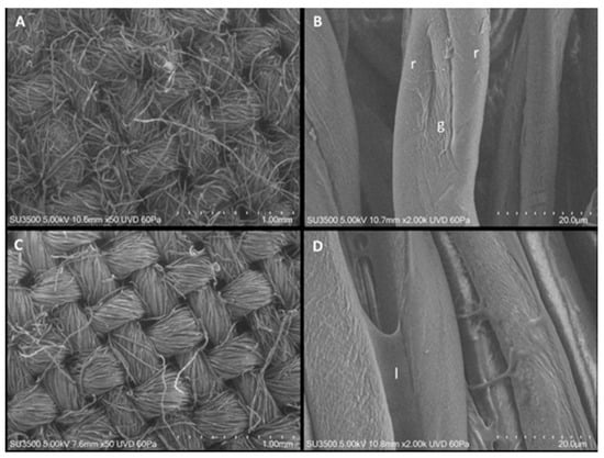 VP-SEM characterization of textiles without coating (A,B) and with coating (C,D). Textile without coating is imaged at 50×, scale bar 1 mm (A). The texture of the weaving is visible. It is formed by bundles of fibers arranged in a messy way (B). Textile single fiber is imaged at 2000×, scale bar 20 µm, it appears similar to a ribbon, longitudinally grooved by a gutter (g), which is limited at the sides by bulging ridges (r). Fiber surface appears wrinkled in some parts, exfoliated in others. (C) GO-coated textile is imaged at 50×, scale bar 1 mm. The texture of the weaving is visible, fiber bundles appear as having a more compact and ordered aspect. (D) Coated textile fibers are imaged at 2000×, scale bar 20 µm. (l).