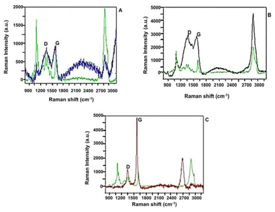 Raman spectroscopy of textiles treated with different concentrations of GO: spectra collected on GO 1% (A, blue curve), GO 5% (B, black curve), GO 10% (C, red curve). Each spectrum is compared with that corresponding to the background signal of the cotton fibers (green curve).