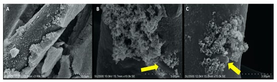 SEM microscopy of textiles used as filters. (A) 10% GO-coated fibers covered with a thick layer of the virus; (B) GO sheets (arrow) emerging from fiber surface, surrounded by virus particles; (C) GO sheets (arrow) surrounded by viral aggregates.