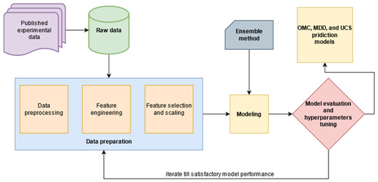 The workflow of the OMC, MDD, and UCS prediction models is illustrated in Figure 1. The initial task is retrieving the gathered experimental data that comprise information regarding the proportion of soils and stabilizers, Atterberg limits, compaction properties, soil classification, curing ages, and unconfined compressive strength of the stabilized soils. Then, data preparation follows, in which data preprocessing, feature engineering, feature selection, and scaling are performed. The next major step is to fit the data using the ensemble method (either bagging or boosting regression trees). The performance of the models is then evaluated using a previously unseen dataset. The model training and validation process is iterated by adjusting the hyperparameters till the best result is obtained. The detail of the major activities is discussed below.