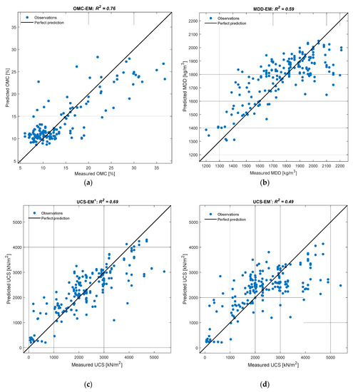In this section, the performance of the developed OMC, MDD, and UCS models is presented. Examining the generalization performance, how well the models can make predictions for data that was not observed during training, is very essential compared to how well they fit the training set. The coefficient of determination, , is one of the statistical measures applied to examine the generalization performance of all the models. The score indicates how well the developed OMC, MDD, and UCS models explain and predict future outcomes. It yields a score between 0 and 1. The training performance of all models is illustrated in Figure 2. Regression plot for predicted vs. measured OMC, MDD, and UCSs with their corresponding validation R-square scores, showing the true versus the predicted response. It can be perceived from Figure 2 that the score of OMC-EM, MDD-EM, and UCS-EM+ models exceed 0.50. Observably, OMC-EM performs best (= 0.76), followed by UCS-EM+ ( = 0.69), and MDD-EM ( = 0.59). This validates that these models reasonably track their corresponding target features during the training stage. Among all, UCS-EM− perform least with ( = 0.49). This model entails all features under the category of amended soils (soil, cement, and lime), Atterberg (LL, PL, and PI), and soil classification, but does not entail features that describe the compaction properties (OMC and MDD). Hence, the weak performance of UCS-EM− model corroborates that the features OMC and MDD have significant importance in predicting UCS.