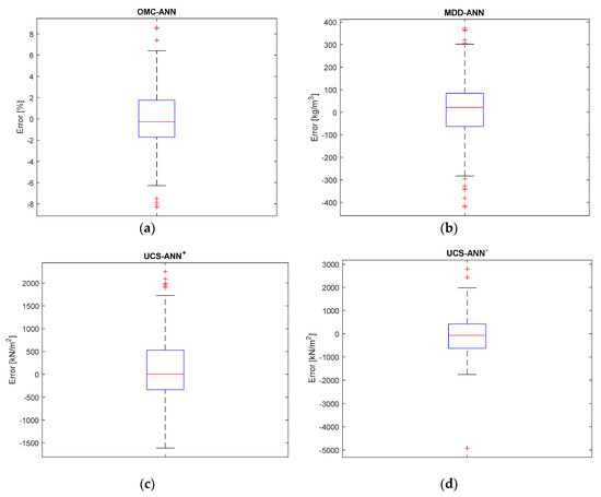 The difference between the actual and the predicted OMC, MDD, and UCSs by the developed four ANN models are calculated, and their distributions are visualized with a boxplot in Figure 3. The median of the errors is designated by a red line within the blue box, embracing the middle 50% (25th–75th percentiles) of the errors. It can be seen from Figure 3 that the medians of errors of all the models are closer to either the first or the third quartile. For instance, the medians of the errors of OMC-ANN and UCS-ANN+ models are closer to the first quartile. This means that the distributions of the errors are slightly skewed to the right. The whiskers stretch from the ends of the box to the smallest and largest error values. Errors greater than 1.5 box lengths above the whiskers are outliers and characterized by a red plus sign. It can be observed that there are a significant number of outliers in all models.