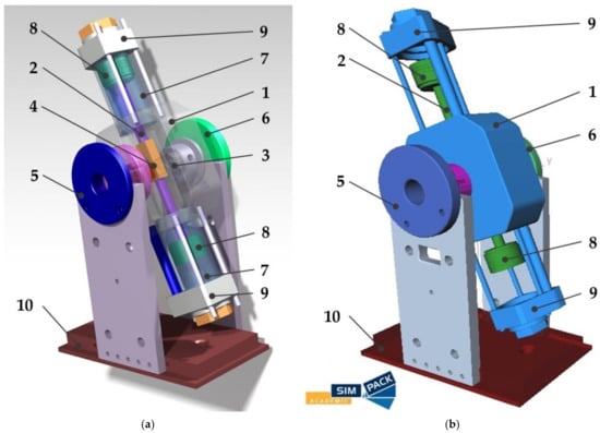 A non-conventional engine: (a) a three-dimensional model of a non-conventional engine design; (b) a schematic model in the Simpack software: 1—a plate, 2—a connecting rod, 3—an auxiliary stone, 4—a stone, 5—a first output, 6—a second output, 7—cylinders, 8—pistons, 9—heads of cylinders, 10—a stand.