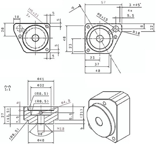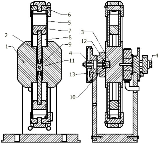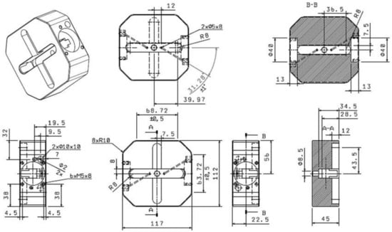 A plate was adapted to distribute the working medium. The distribution of the working medium is accomplished by means of a crosshead that includes the extra-level grooves (2) and (3). The input of the working medium is placed on the opposite cylinder side and inserted using a metal tube. The output from the functional block is located on both sides. One side includes only the shaft output, which is mounted to a stand. The other side is connected to a gearbox with a gear ratio of ig = 0.5. The shaft output from the gearbox leads to an attachment of the engine stand. Detailed drawings of the selected main bodies are shown in Figure 3, Figure 4, Figure 5 and Figure 6.