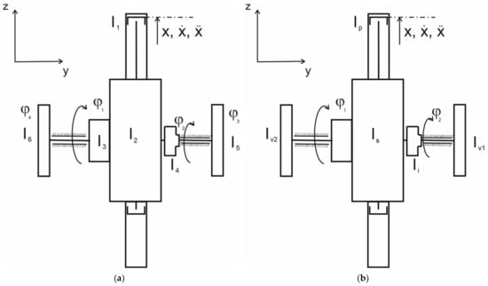 where I1, I2, I3, I4, I5, and I6 are the moments of inertia of individual bodies performing rotational movements (Figure 7a); m1 is the mass of the body performing a translation movement; deviations φ1, φ2, φ3, and φ4 are the angular coordinates of individual bodies (Figure 7a); and x1 is a translation coordinate (Figure 7a).