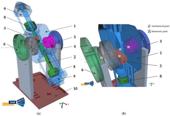 A multibody model of the engine in the Simpack software package (a), the detail of joints (mechanical and kinematic joints) (b): 1—a plate, 2—a connecting rod, 3—an auxiliary stone, 4—a stone, 5—a first output, 6—a second output, 8—pistons, 9—heads of cylinders, 10—a stand.