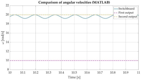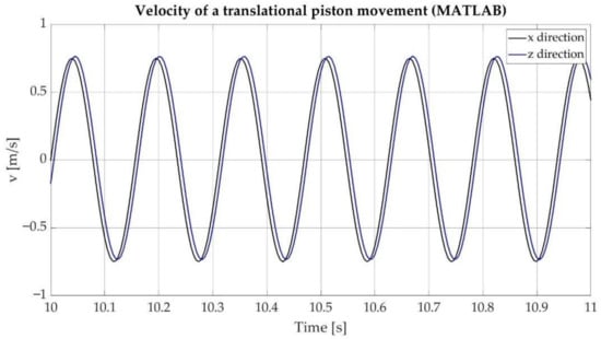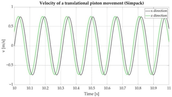 The resulting waveforms and graphs were processed in MATLAB to compare them within individual figures. From all the results, we selected waveforms for some kinematic quantities, including for a functional block (Figure 9), a piston mechanism (Figure 10 and Figure 11), the first output, the second output, and a switchboard (Figure 12 and Figure 13).