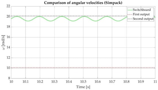 Comparison of the angular velocities of the first output, second output, and switchboard—results from Simpack.
