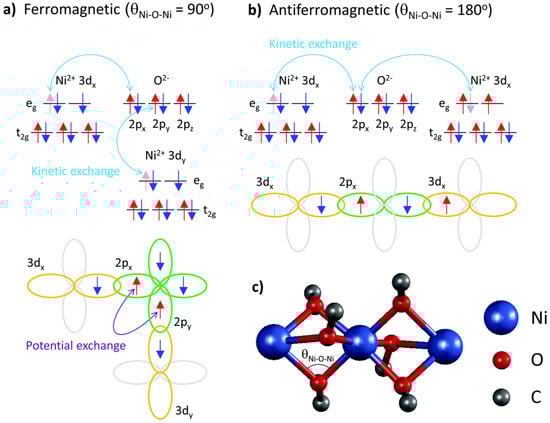 Super-exchange coupling between nearest-neighbor 3d orbitals of Ni via the ligands of O2− (2p orbitals). (a) In the case of a 90° angle between Ni-O-Ni, super-exchange results in a ferromagnetic coupling between the orthogonal oxygen 2p orbitals; (b) for an angle of 180° between Ni-O-Ni, an antiferromagnetic coupling occurs due to the nickel and oxygen orbitals overlapping; and (c) geometry of nickel(II) acetylacetonate (Ni(acac)2) molecular magnets. From ref. [], originally published under a CC-BY license.