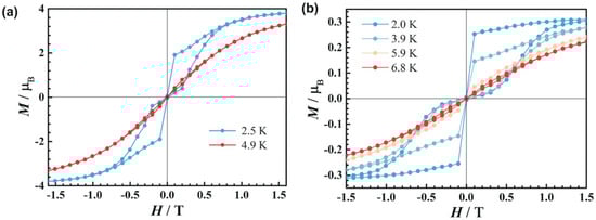 Hysteresis loops, measured at different temperatures in the systems (a) 1Dy; (b) 3Dy. Reprinted from [], copyright 2020, with permission from Wiley.