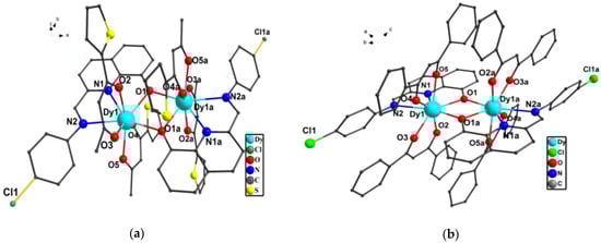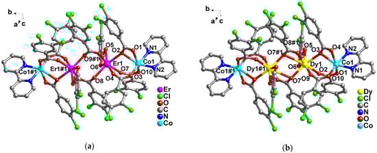 Molecular structures of the complexes containing (a) CoII2-ErIII2 and (b) CoII2-LnIII2. Hydrogen atoms are omitted for clarity. Reprinted from [], copyright 2020, with permission from Elsevier.