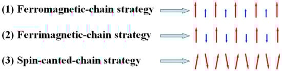 A systematic overview of the possible strategies to prepare such SCMs was given in 2010 by Sun et al. (Figure 5) []. While the ferromagnetic spin arrangement is not often found because of the complex dipole-dipole interactions in the chain, it can still be found in different spin structures, ferromagnetically coupling anisotropic spin carriers. The ferrimagnetic spin state is often more stable, and the first reported SCM also showed ferrimagnetic coupling. Spin-canted chains show a weak ferromagnetic order, and SCMs based on this principle are not often observed []. In this simple approach, interchain interactions, chirality, photo-switchable states or other highly interesting possibilities, have not yet been taken into account [].