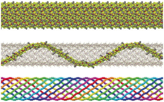 Another shape of the chain was found by Houard et al. in nitronyl-nitroxide organic radical chains. In [Tb(hfac)3NIT-O-Hexyl]n latter structures, with hfac− = hexafluotoacetylacetonate, chiral curled chains were formed, building supramolecular tubes with a diameter of 4.5 nm and large coercive fields, as visible in Figure 7 [].