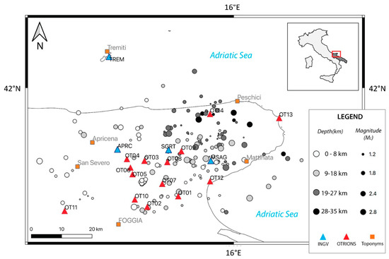 - University of Bari “Aldo Moro” OTRIONS, Seismic Networks of Gargano Area (Italy). 2013. Available online: https://www.fdsn.org/networks/detail/OT/ (accessed on 28 May 2021).