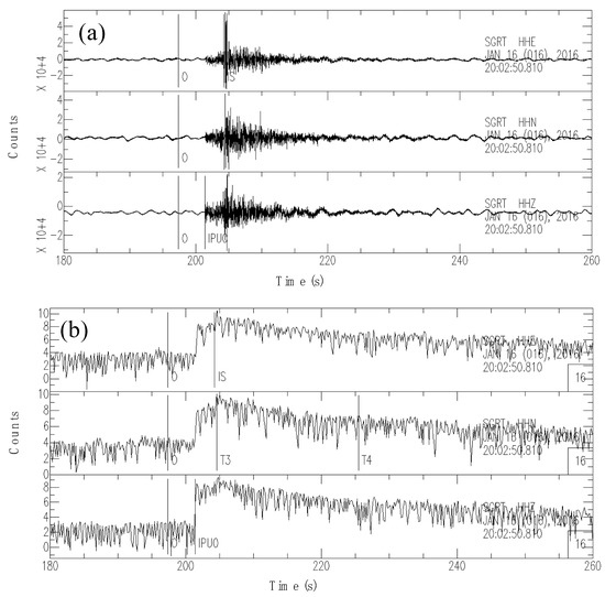 - An initial marker, named , placed after the S-wave arrival, when the envelope shows a decreasing trend;