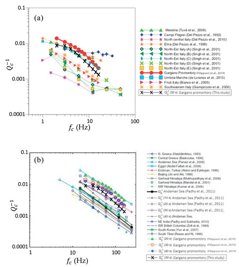 - Giampiccolo, E.; Tuvè, T. Regionalization and Dependence of Coda Q on Frequency and Lapse Time in the Seismically Active Peloritani Region (Northeastern Sicily, Italy). J. Seism. 2018, 22, 1059–1074. [Google Scholar] [CrossRef]