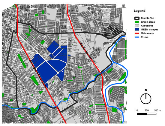 There have been different efforts and projects to improve urban accessibility within the MMZ; an example is Distrito Tec, which is a project led by the Instituto Tecnológico de Monterrey (ITESM) university in collaboration with the community in the vicinity of the campus and local authorities. It aims to improve the urban environment near the university campus for citizens and campus users. This project is one of the City Improvement Districts (CIDs) implemented in Monterrey, emerging as proposals of urban regeneration to increase citizen engagement at strategic points of the MMZ. Figure 1 shows the facilities of the ITESM Monterrey Campus, allotments and green areas within Distrito Tec.