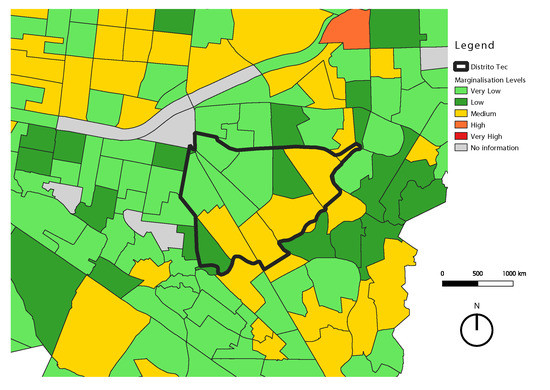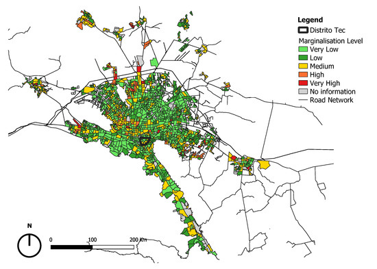 Figure 2 shows the marginalisation levels in the MMZ according to the CONAPO [20], as well as the location of Distrito Tec within the MMZ. It can be observed that most of the AGEBs in the MMZ lie within the low (22.91%) and very low (41.42%) marginalisation levels, with few classified as medium (20.76%), high (4%), or very high (1.63%). There are 9.19% of the AGEBs that are not categorised. It is worth mentioning that the regions with higher marginalisation levels are located in the outskirts of the MMZ, usually places with low levels of accessibility.
