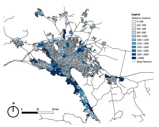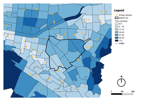 As a result of the lack of destinations available within Distrito Tec and in most surrounding areas, eight out of eleven AGEBs of the Distrito Tec’s polygon require over a 31 min travel time to reach the closest destination. From the three AGEBs left, a travel time between 26 and 30 min is needed to reach the closest public general hospital. These results highlight that the location of hospitals follows metropolitan and regional planning processes, where access at the local scale is not relevant. Additionally, as seen in Figure 16, most of the hospitals tend to cluster. This has to do with the complementarity that one can give to others. A consequence of these localisation patterns is that travel distances from all neighbourhoods that do not have a nearby hospital are considerably high and demand motorised transport modes.