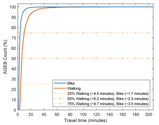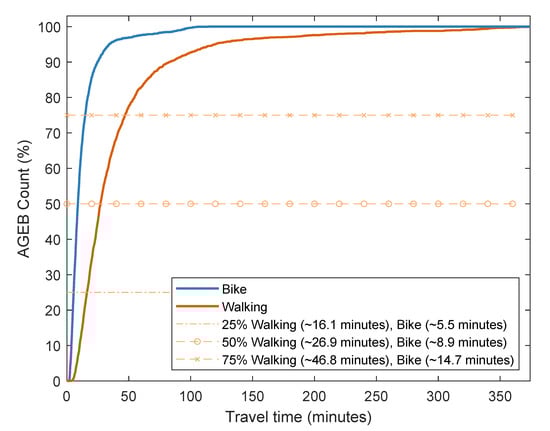 Figure 8 compares the performance of both transport modes (walking and bicycle) to access the closest public hospital. For this specific variable, the differences between one mode and the other are more evident. This is related to the lower number of destinations available at the metropolitan level (in contrast with Figure 6, the number of hospitals is evidently lower than that of schools). Hence, faster transport modes, such as bicycles, will outperform walking by a considerable margin: for 75% of the AGEBs to reach the closest public hospital travelling by foot, it takes 46.8 min; in contrast, it only takes 14.7 min by bicycle.
