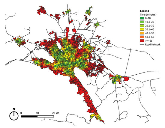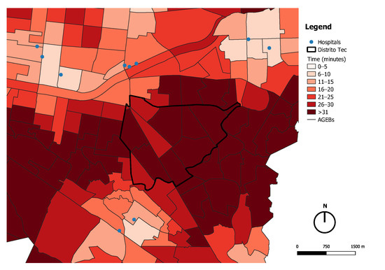 Figure 7 presents the average travel time by AGEB to the closest public hospital by foot. The map shows a considerable divergence of accessibility between AGEBs, with many going beyond the 30 min travel time, mainly due to the low density or nonexistence of hospitals, predominantly in suburban areas.