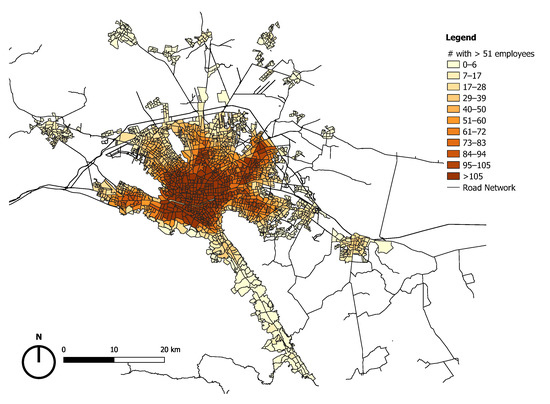 Figure 9 shows the number of economic activities that employ 51 persons or more (main employment centres) that can be accessed within a 15 min travel time by bicycle. It can be appreciated that most of the AGEBs with higher levels of accessibility (+73 destinations) are located in the central areas of the city, with a gradual decline towards the outskirts. At first sight, such a result might be perceived as unusual, considering that the MMZ is an industrial city and that most industries are located in suburban areas. Nevertheless, industries usually have very large complexes that occupy vast areas of land and make them separate from one another, reducing access to them in short periods. In contrast, even though they are smaller in size and number of employees, the economic activities that concentrate in central areas of the city (such as commerce and services) require smaller areas of land compared to industries and are located closer to each other.