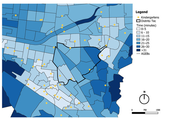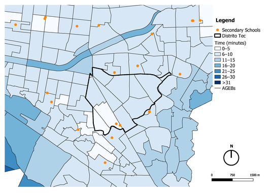For the Distrito Tec’s analysis, the computations were: number of employment centres with 51 or more employees accessible within a 15 min travel time, the number of retail trade supermarkets available within a 15 min travel time, and the time required to access the five nearest schools or hospitals; here, an individual study was conducted for each category mentioned in Table 2.