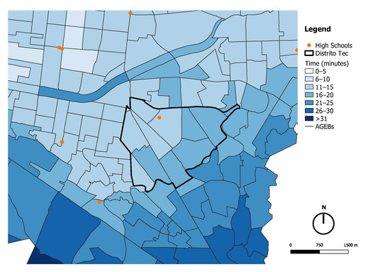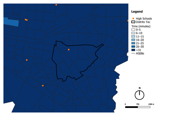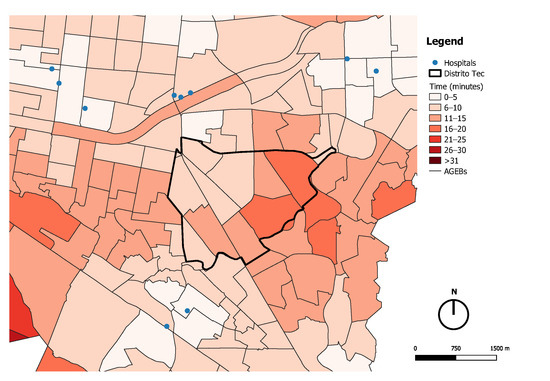 Figure 17 shows the average travel time by AGEB to the closest public general hospital travelling by bike. In comparison to Figure 16, the travel times, both for Distrito Tec and the surrounding areas, drastically decrease. Nonetheless, many AGEBs still are beyond the 15 min parameter. In the Distrito Tec Area, six AGEBs require a 6–10 min travel time, three an 11–15 min travel time and two a 16–20 min travel time.