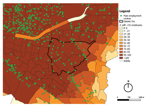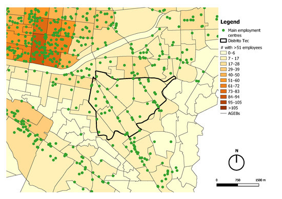 Even though there is a high number of economic activities, the access levels are relatively low. The 11 AGEBs that compose the Distrito Tec Area are in the same access class of 6–17 destinations within a 15 min travel time by foot. From the surrounding areas, the northeast, east, southeast southwest, and west have very low access levels, all in the class of 0–6 destinations. This has to do with the low number of economic activities located in these areas. Once again, the population living in those areas has to travel to other parts of the city to work, causing traffic, as well as other negative effects.