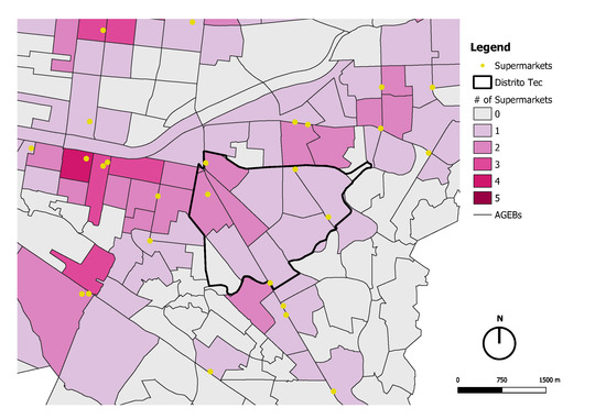 From the 11 AGEBs that conform the Distrito Tec Area, 2 cannot access a single supermarket, 6 can access 1 destination, and 3 can access 2 destinations. On that account, most of the AGEBs meet the parameters of the 15 minutes city using foot as the travel mode.
