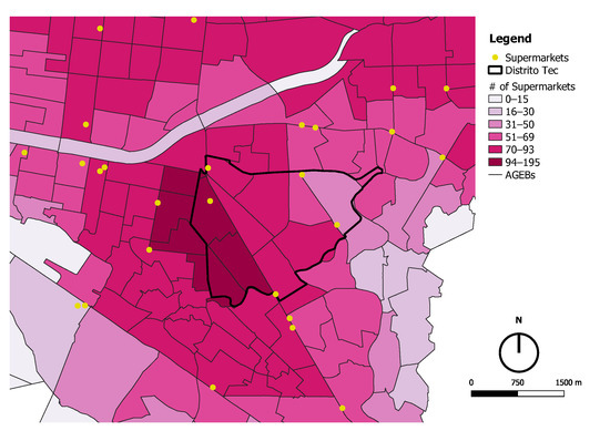 The next variable is access to commercial activities, specifically to supermarkets. Due to a lack of public markets, as seen in many other Mexican cities, Monterrey’s population does most of their grocery shopping at supermarkets. Hence, supermarkets are one of the most frequented destinations among the local population, and access to them is key to guaranteeing satisfactory quality of life.