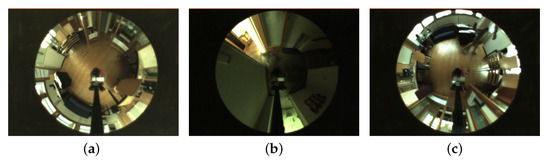 The images were captured both in rooms that present a repetitive structure and therefore, some visual similarity (such as corridor, toilets, etc.), and also in some other more specific rooms, which present visually distinctive characteristics. Furthermore, the Freiburg dataset presents two parts of the laboratories separately. Those parts are completely independent and they are not related; hence, they can be considered as different environments. The present work was conducted by using the part A of the Freiburg dataset, since it is composed by five rooms that are present in every dataset (usual rooms). The trajectory studied is the path followed by the robot that visits 5 out the 9 rooms which compose the environment. The map of the proposed dataset is shown in [47] and it is entitled Part A. For this work, the trajectory studied was the one depicted with the blue dashed lines. Table 1 shows the abbreviation code, name and number of images for each evaluated room. As for appearance of the omnidirectional images, three examples are shown in Figure 1. These images were captured, respectively, under three different illumination conditions. In the present work, the omnidirectional images were used directly as they were obtained, i.e., they were not processed to obtain either a panoramic image nor a set of monocular images.
