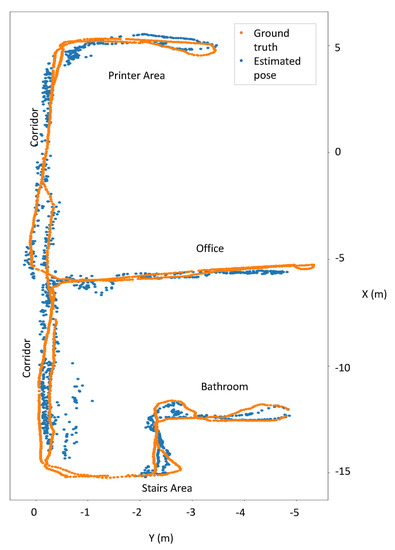 Table 3 also shows a column with the average results for the five rooms. Moreover, Figure 5 shows the trajectory map of the ground truth data and the pose estimations provided by the CNNs. In general, pose predictions fit real poses. There are critical results concerning the office and the extreme parts of the corridor. In these areas, the predictions are significantly inaccurate. Therefore, improvements should be addressed in those two rooms.