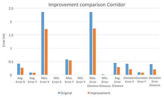After carrying out the division and training of the regression CNNs (one per area), the pose estimation is performed in the corridor room. The results are shown in the Figure 7. From it, the conclusion reached is that the errors are considerably reduced. Despite the fact that the average error has been reduced, the maximum error is still relatively high. Furthermore, the standard deviation has also been reduced; hence, there is a lower number of extreme cases. This room division presents an improvement along the X axis.