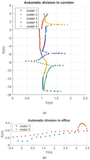 Clusters obtained with spectral clustering for (a) corridor with 5 divisions and (b) office with 2 divisions.